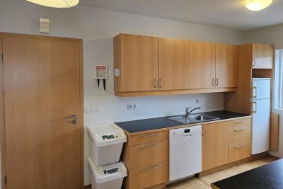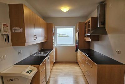 Eldhús: Parket á gólfi, innrétting með góðu geymslu og vinnuplássi. Helluborð og bakarofn í vinnuhæð. Stæði í innréttingu fyrir uppþvottavél og ísskáp.