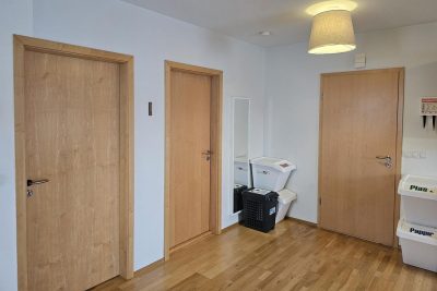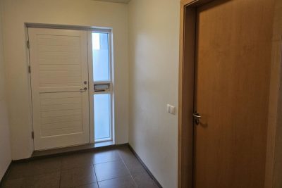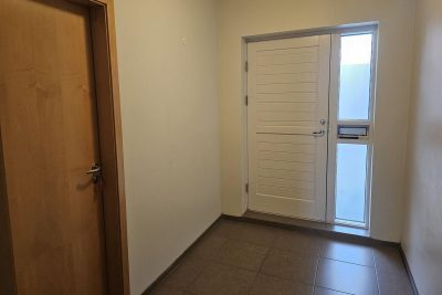 Gengt er í íbúðina bæði frá götu og af lóð. Anddyri er rúmgott og þaðan er gengið í forstofuherbergi og geymslu. Þar innaf er síðan breiður gangur/hol sem tengir saman önnur rými íbúðarinnar; eldhús og stofur, baðherbergi og hjónaherbergi.