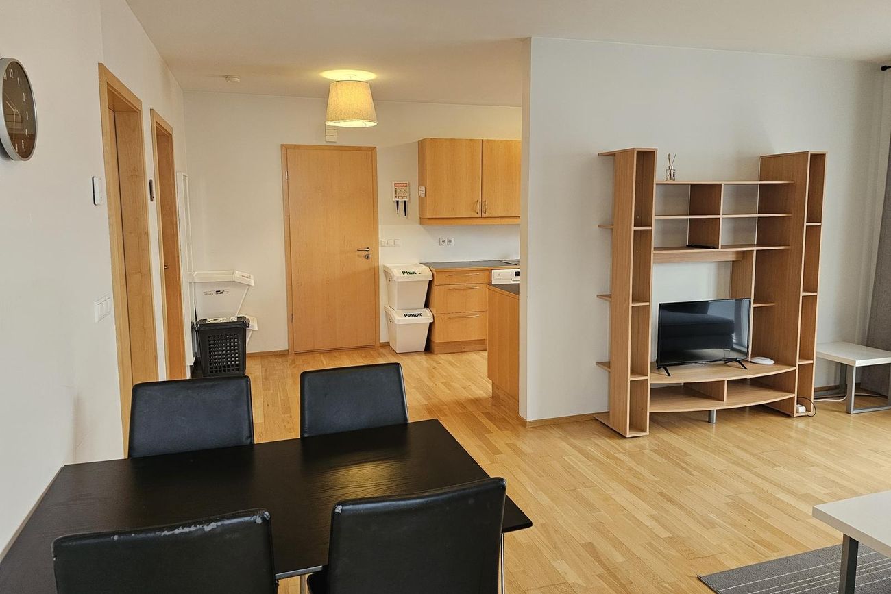 Stofa og borðstofa: Björt og rúmgóð með parket á gólfum.