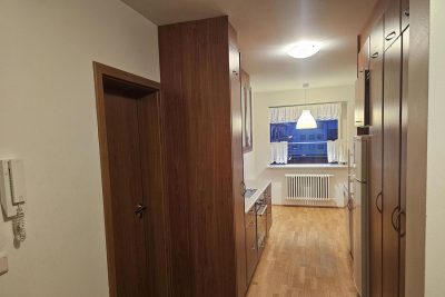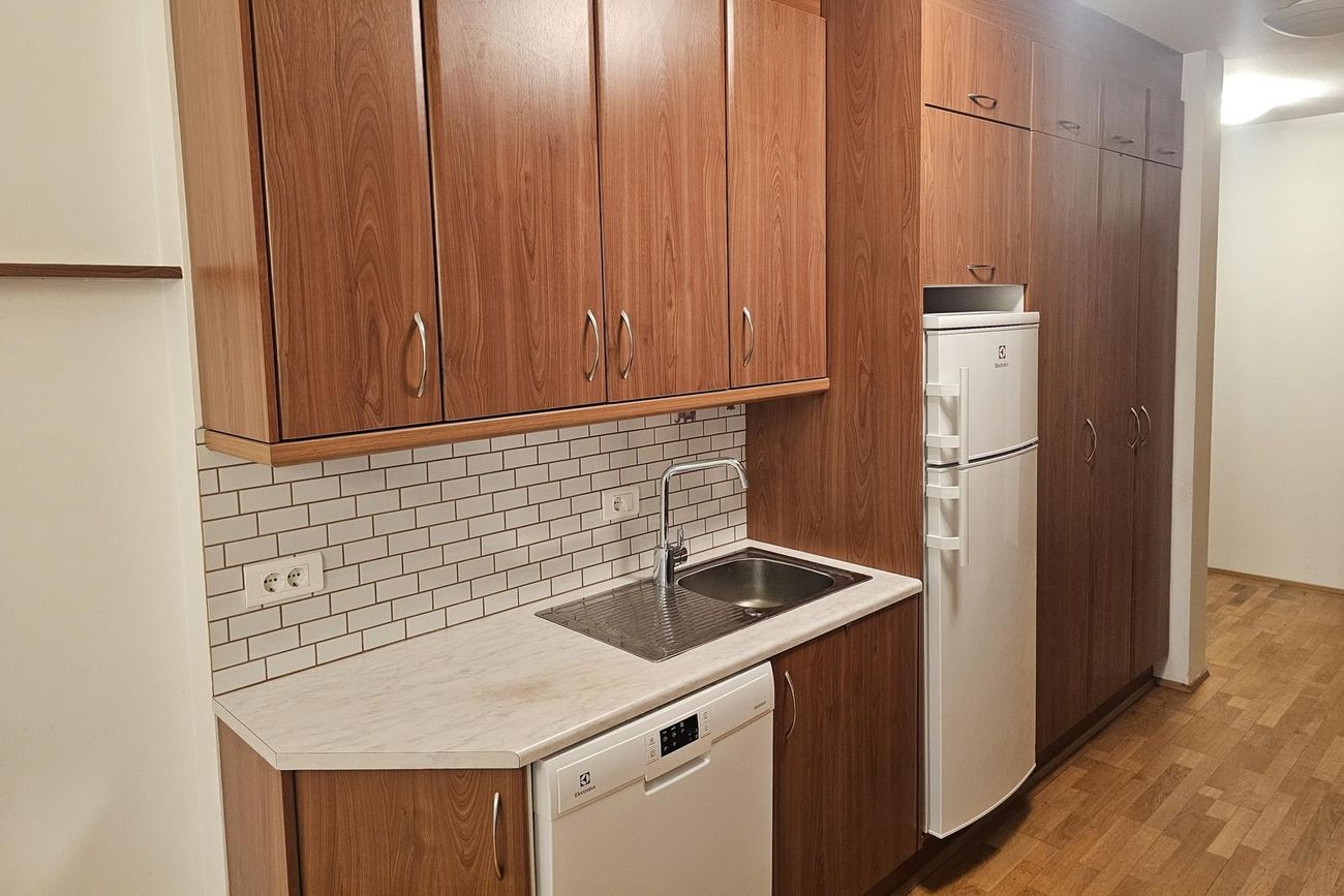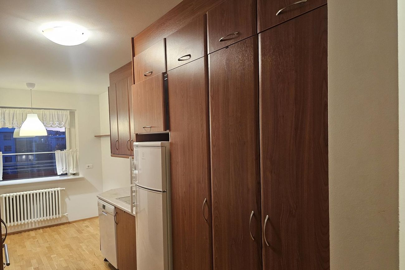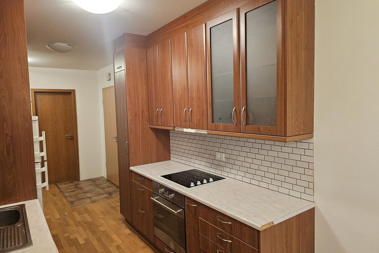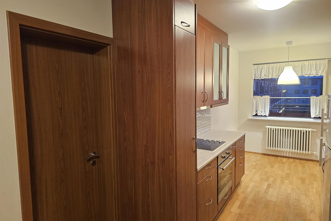Eldhús: Ágæt eldhúsinnrétting með miklu skápaplássi og góðu vinnurými, eldavél, helluborð og vifta. Borðkrókur við glugga.