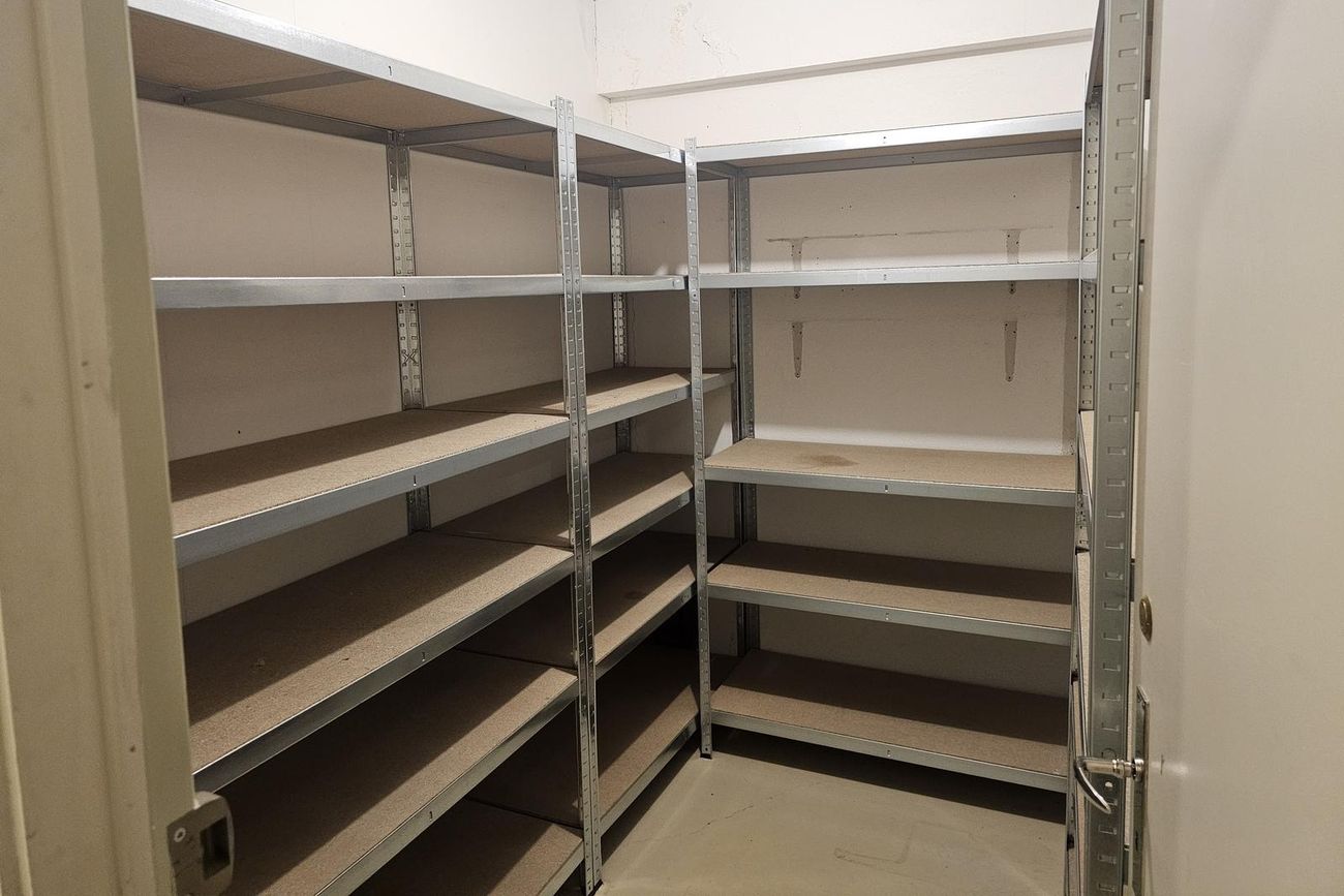 Geymsla: Málað gólf, hillur.