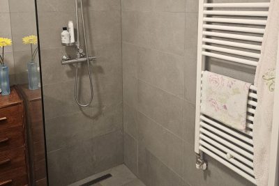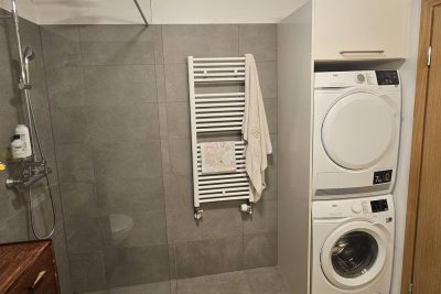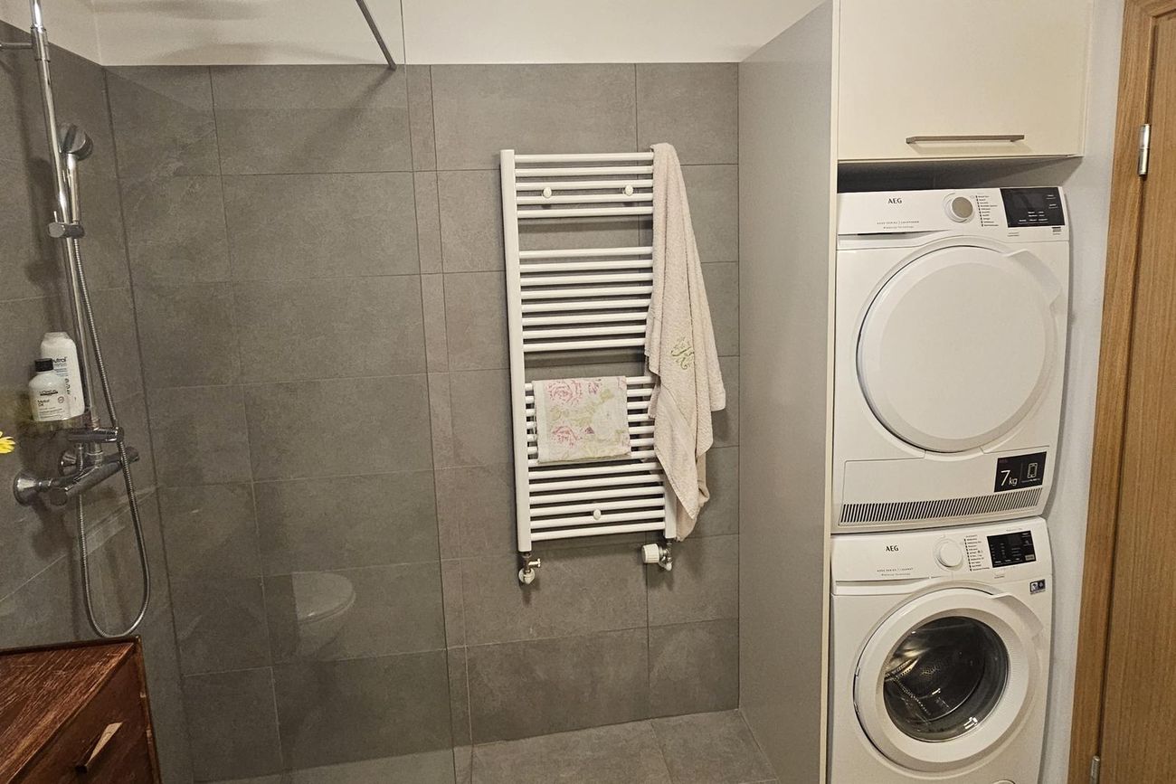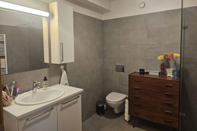 Baðherbergi er flísalagt í hólf og gólf með vegghengdu salerni, sturtu og innréttingu.