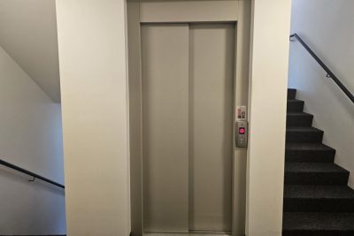 Flísalagt anddyri, lyfta og teppalagður stigagangur í sameign.
