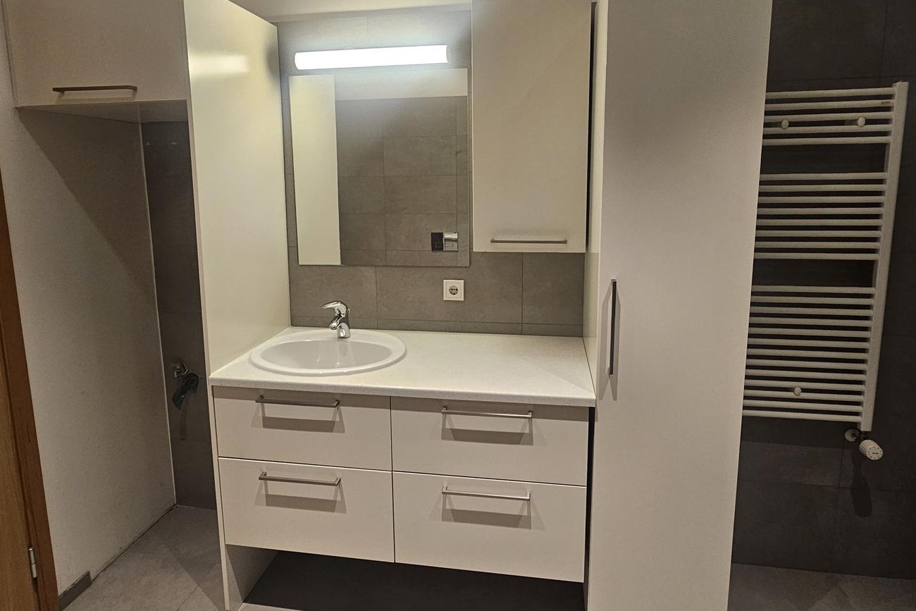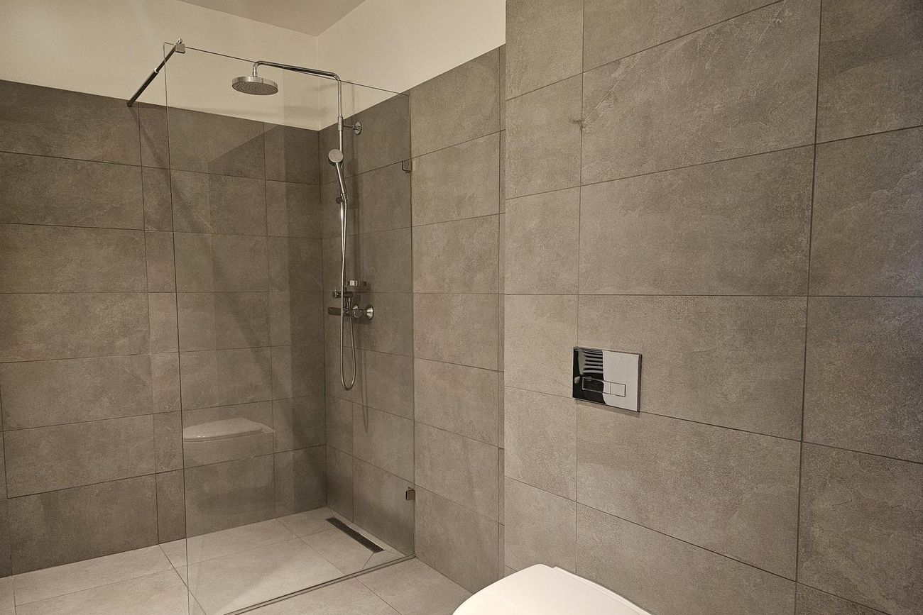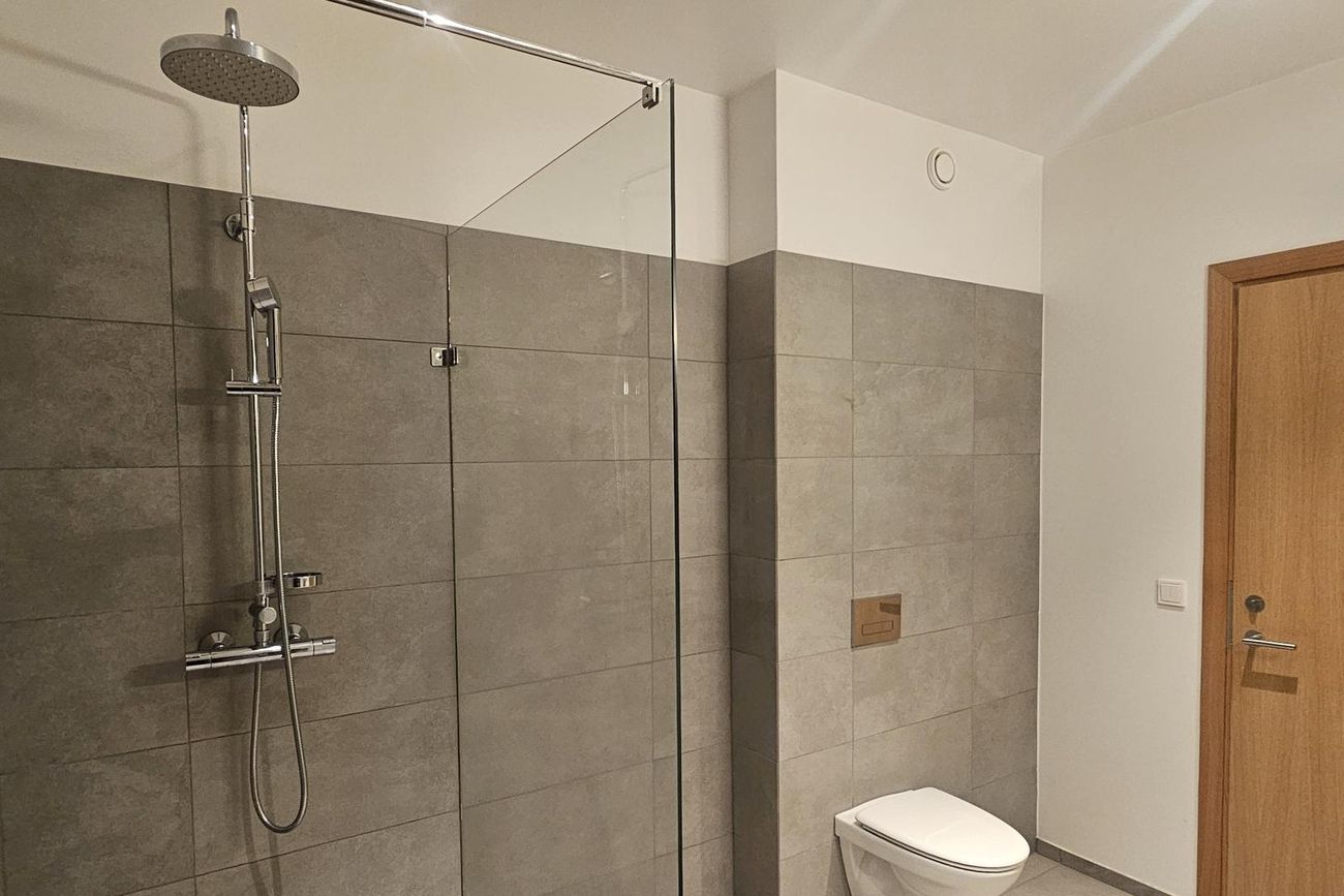 Baðherbergi er flísalagt í hólf og gólf með vegghengdu salerni, sturtu og innréttingu. Þar er tengi fyrir þvottavél og þurrkara.