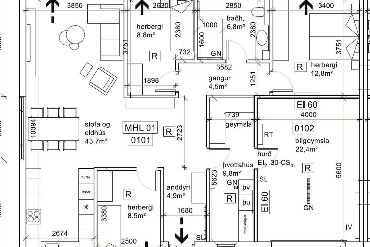 Úr forstofu er gengið inn í alrými sem er samliggjandi stofa og eldhús. Á svefnherbergisgangi eru 2 svefnherbergi og baðherbergi og gengið er inn í þriðja svefnherbergið frá alrými. Þvottahús og geymsla eru samliggjandi. Þaðan er innangengt er úr þvottahúsi í bílageymslu.