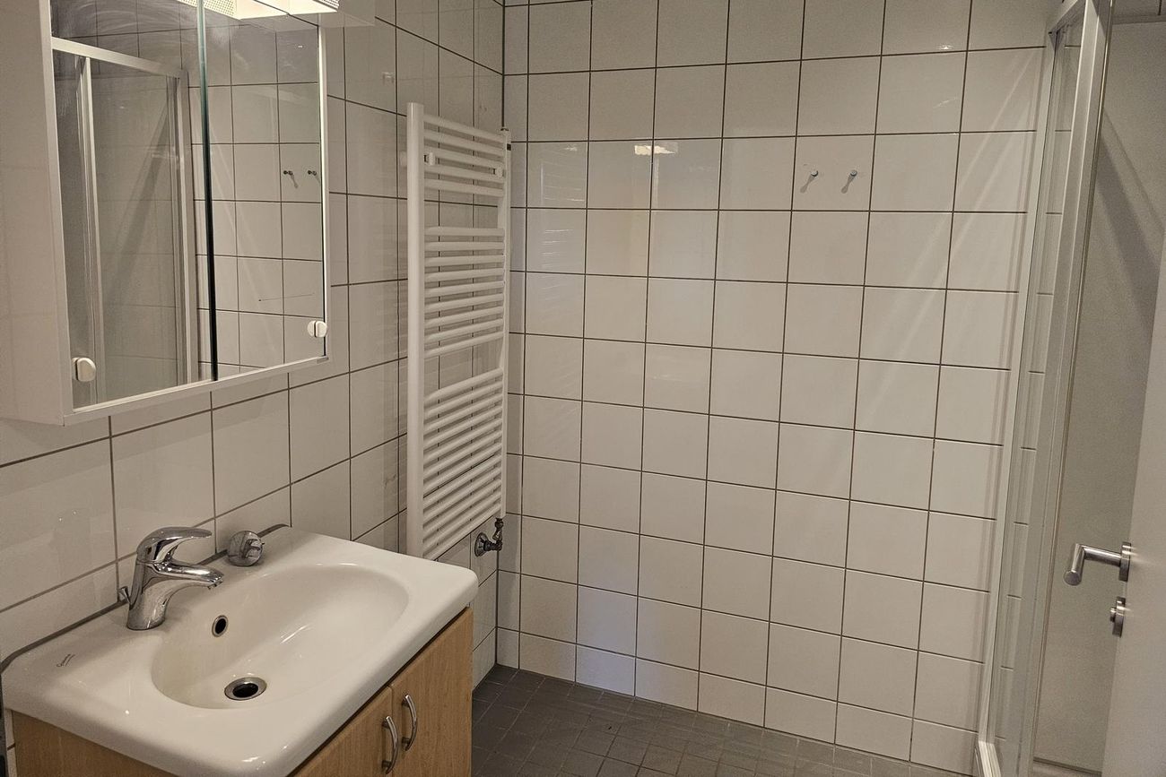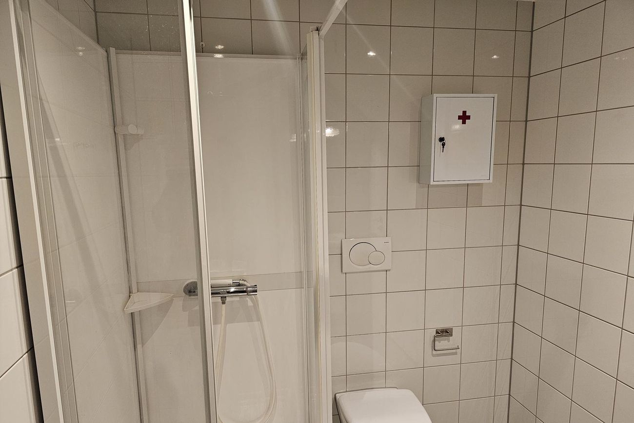 Baðherbergi: Flísar eru í hólf og gólf, upphengt salerni og sturta.