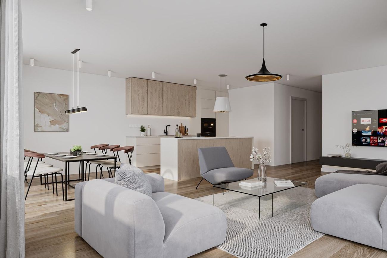 Gengið er í hol. Þaðan er gengið í 2 svefnherbergi og baðherbergi. Stofa og eldhús þar innaf mynda alrými. Gengið er úr stofu um rennihurð út á svalir. Gert er ráð fyrir möguleika á svalalokun. Einnig er gengt úr hjónaherbergi út á svalirnar. Á gólfi íbúðarinnar er fljótandi harðparket (Mammut Oak) frá Birgisson. Vandaðar flísar eru í votrými frá Harðviðarval sbr. fyrirliggjandi skilalýsingu seljanda.