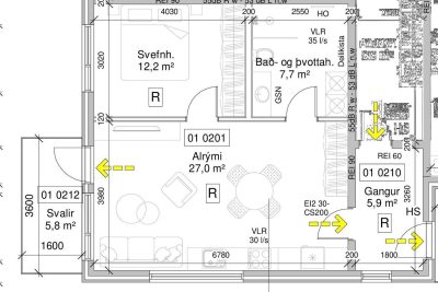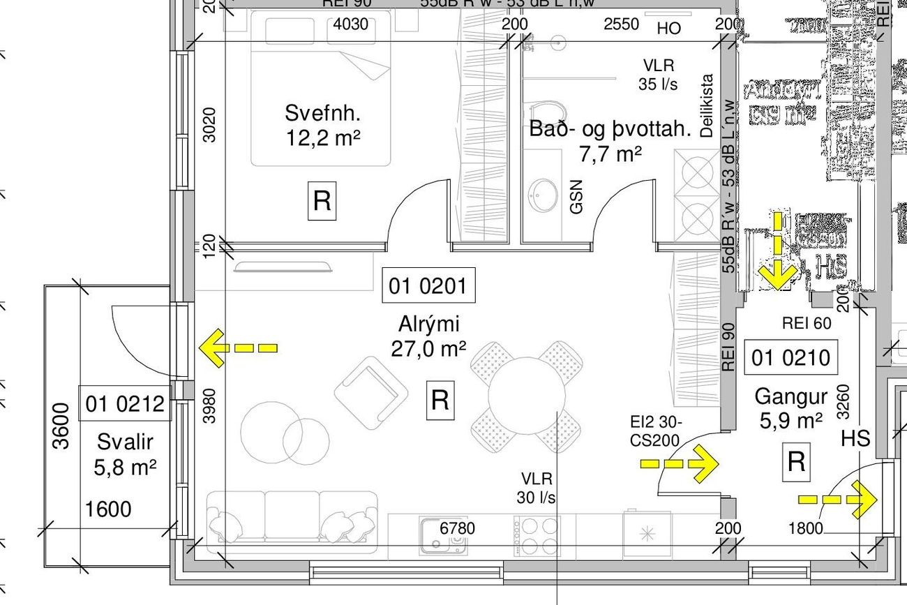 Gengið er upp steyptar tröppur á á efri hæðina. Þaðan er gengið inn í sameiginlega forstofu. Íbúðin skiptist í stofu og eldhús sem mynda alrými, 1 svefnherbergi og baðherbergi. Úr stofu og svefnherbergi er gengið út á 5,8 fm svalir með glerhandriði.