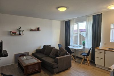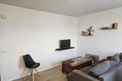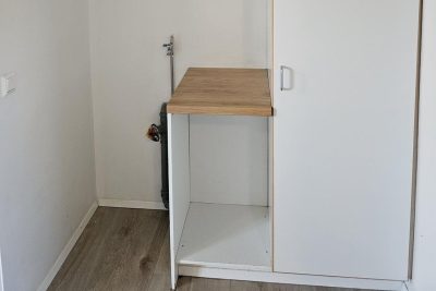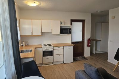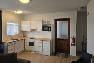 Stofa og eldhús mynda alrými. Eldhúsinnrétting með eldavél í innréttingu. Stæði fyrir þvottavél í líítilli innréttingu á gangi. Baðherbergi er endurnýjað með dúkaflísum á gólfi og fibo-tresbo á veggjum, upphengdur vaskur í innréttingu, sturtuklefi og salerni. Svefnherbergi er bjart og rúmgott.