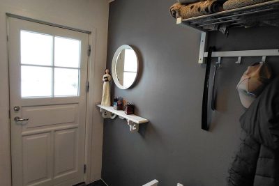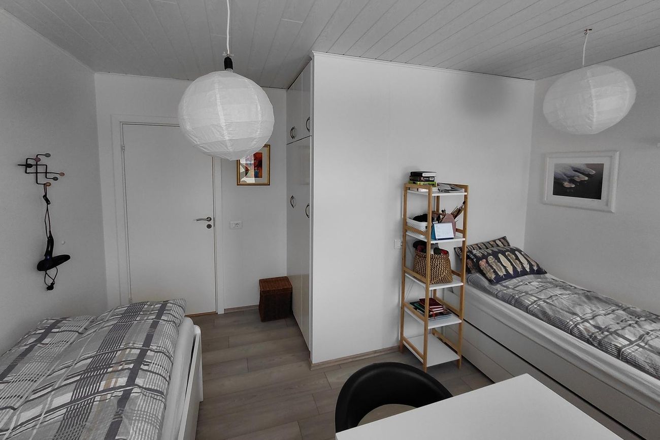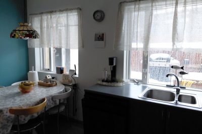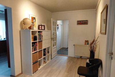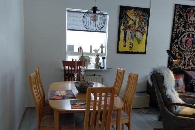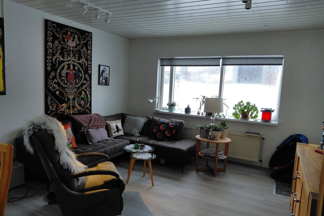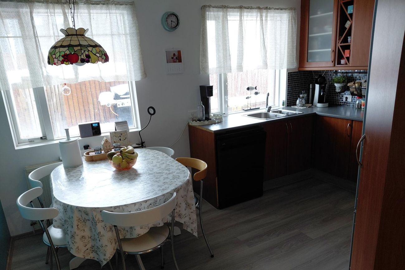 Gengið er í flísalagða forstofu með fatahengi. Þar er þvottahús á hægri hönd, málað gólf og lítil innrétting. Úr forstofu er gengið inn í hol, parket á gólfi, þaðan er gengið í önnur rými íbúðarinnar. Baðherbergi er endurnýjað, flísalagt í hólf og gólf með vegghengdu salerni, sturtu og innréttingu. Svefnherbergi, eru tvö, parket á gólfum og bæði með fataskáp. Stofa með parket á gólfi, þaðan er gengið út á sólpallinn. Eldhús, parket á gólfi, innrétting úr kisuberjavið og borðkrókur.