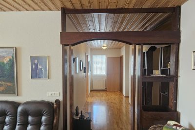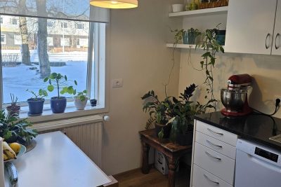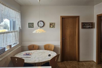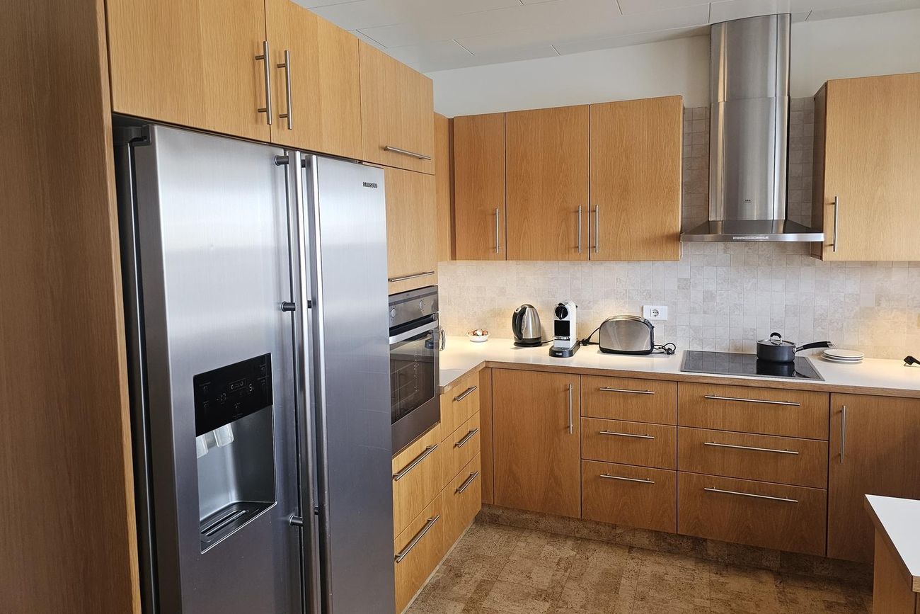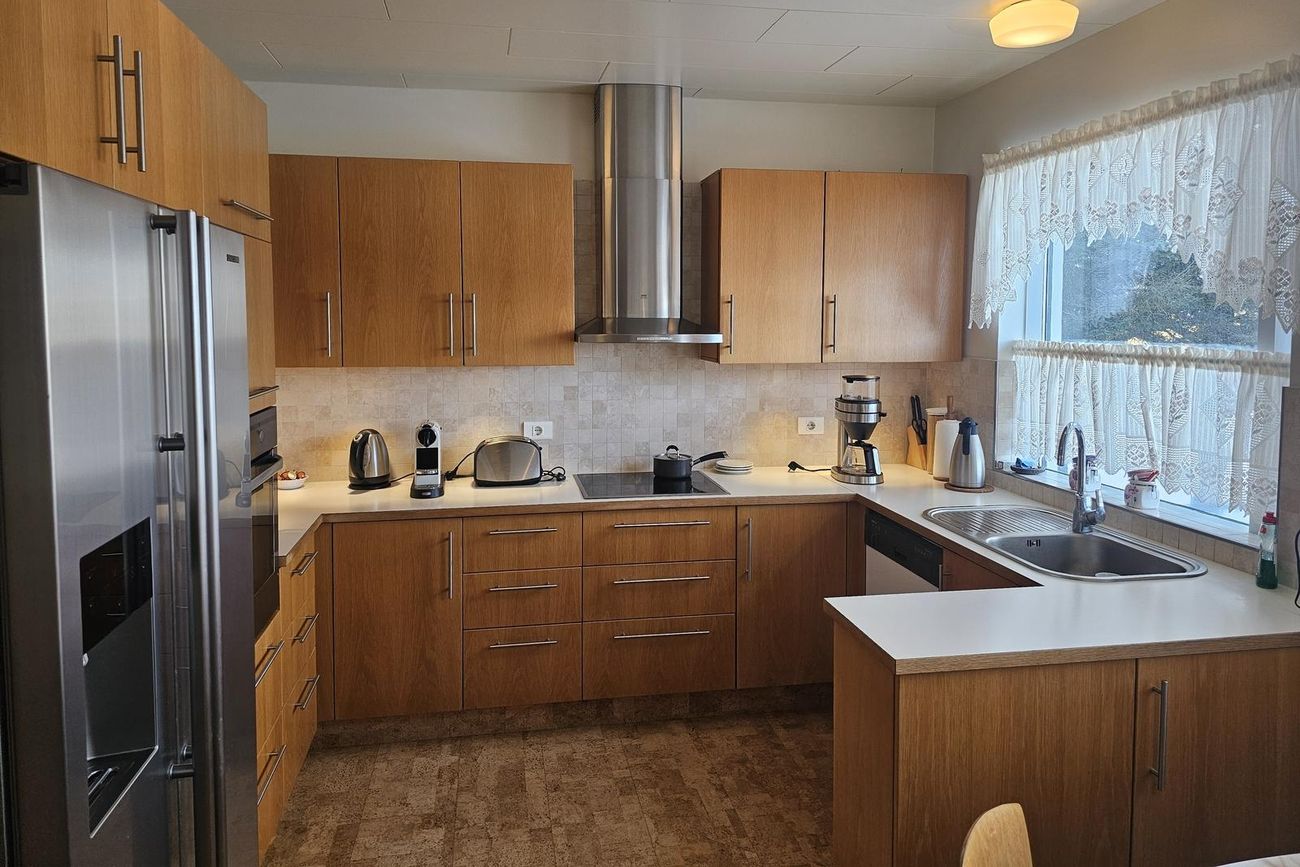 Eldhús: Korkflísar á gólfi. Rúmgóð innrétting, eik , helluborð og  háfur. Bakarofn i vinnuhæð og tvöfaldur ísskápur, borðkrókur og búr inn af eldhúsi.