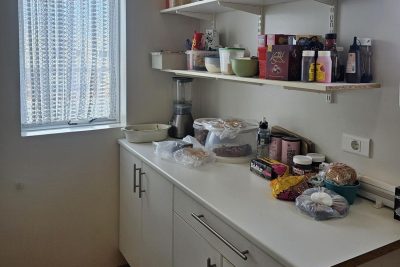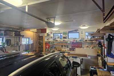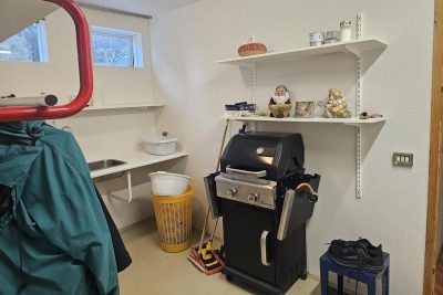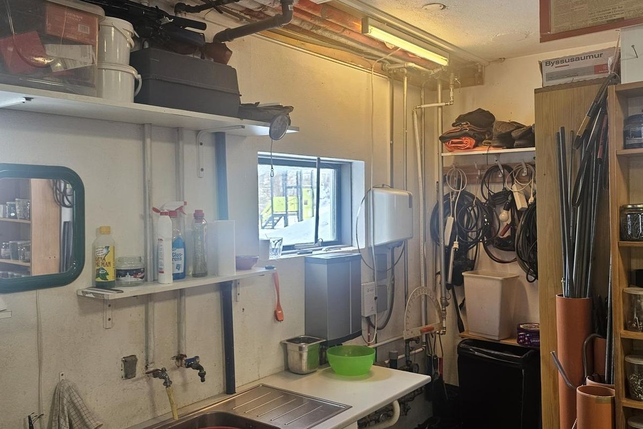 Er 49,0 fm. að stærð. Epoxy á gólfi, rafdrifin innaksturshurð og gönguhurð þar við hlið. Innréttingar og hillur á veggjum. Þar er vatnsinntak hússins og varmaskiptir á heitu vatni.