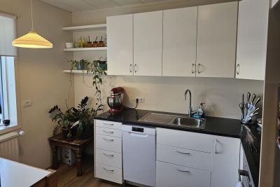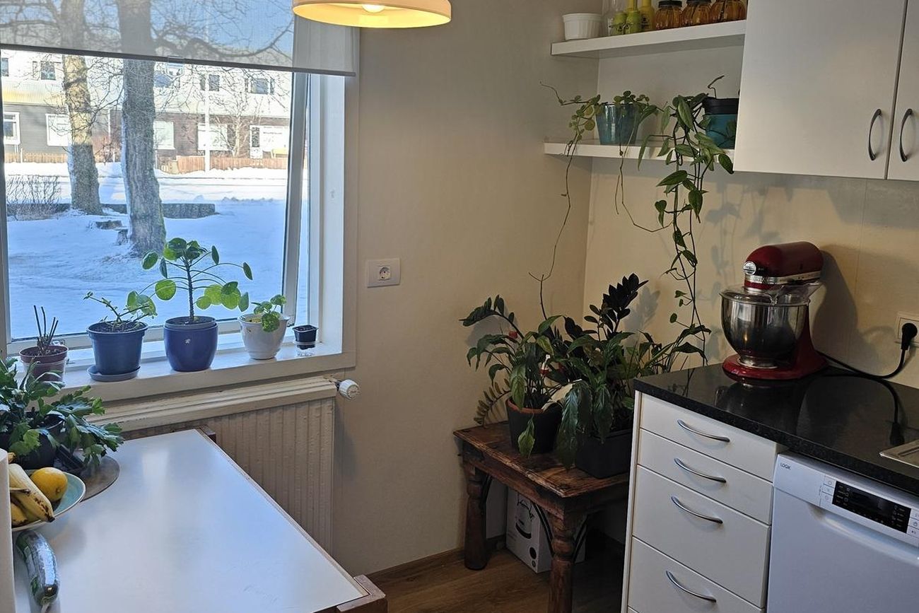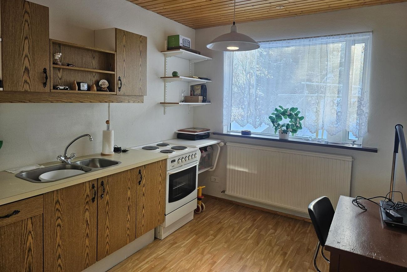 Eldhús: Parket á gólfi, ágæt hvít innrétting. Bakarofn með helluborði.