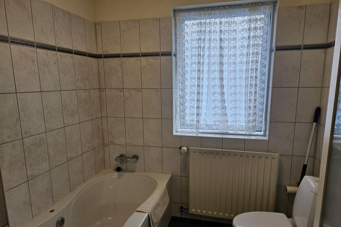Baðherbergi: Flísalagt í hólf og gólf. Góð hvít innrétting, baðkar og sturta.