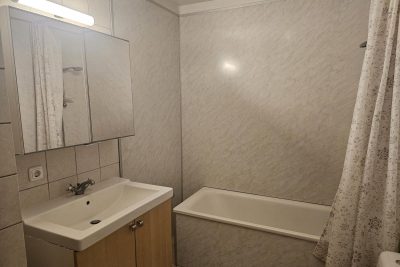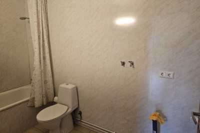 Baðherbergi er með flísum á gólfi og veggjum að hluta. Fibo Trespo á hluta veggja. Baðkar og innrétting. Tengi fyrir þvottavél og þurrkara á baði.